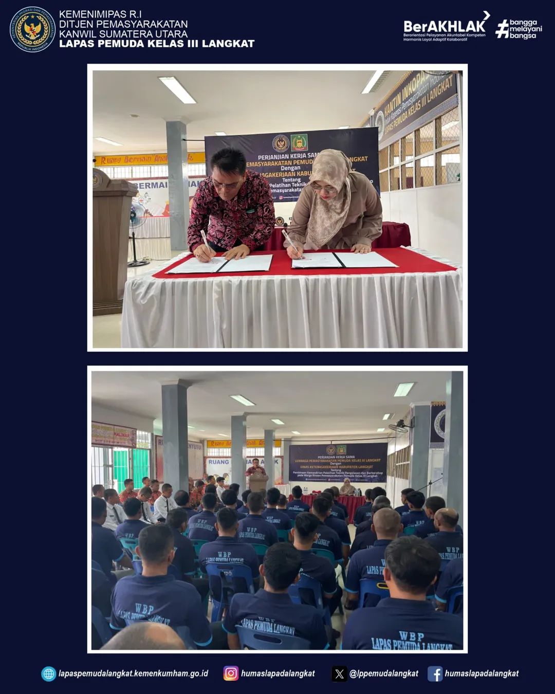 sebarinfo.com, | Lapas Pemuda Kelas III Langkat menjalin kerja sama strategis dengan Dinas Ketenagakerjaan Kabupaten Langkat. Kepala Lapas Pemuda Langkat, Kenal Purba, dan Kepala UPTD Balai Pelatihan Kerja, Dian Ivana Sari, menandatangani Perjanjian Kerja Sama (PKS) pada Jumat, 11 Juli 2025, sebagai langkah awal kerja sama.