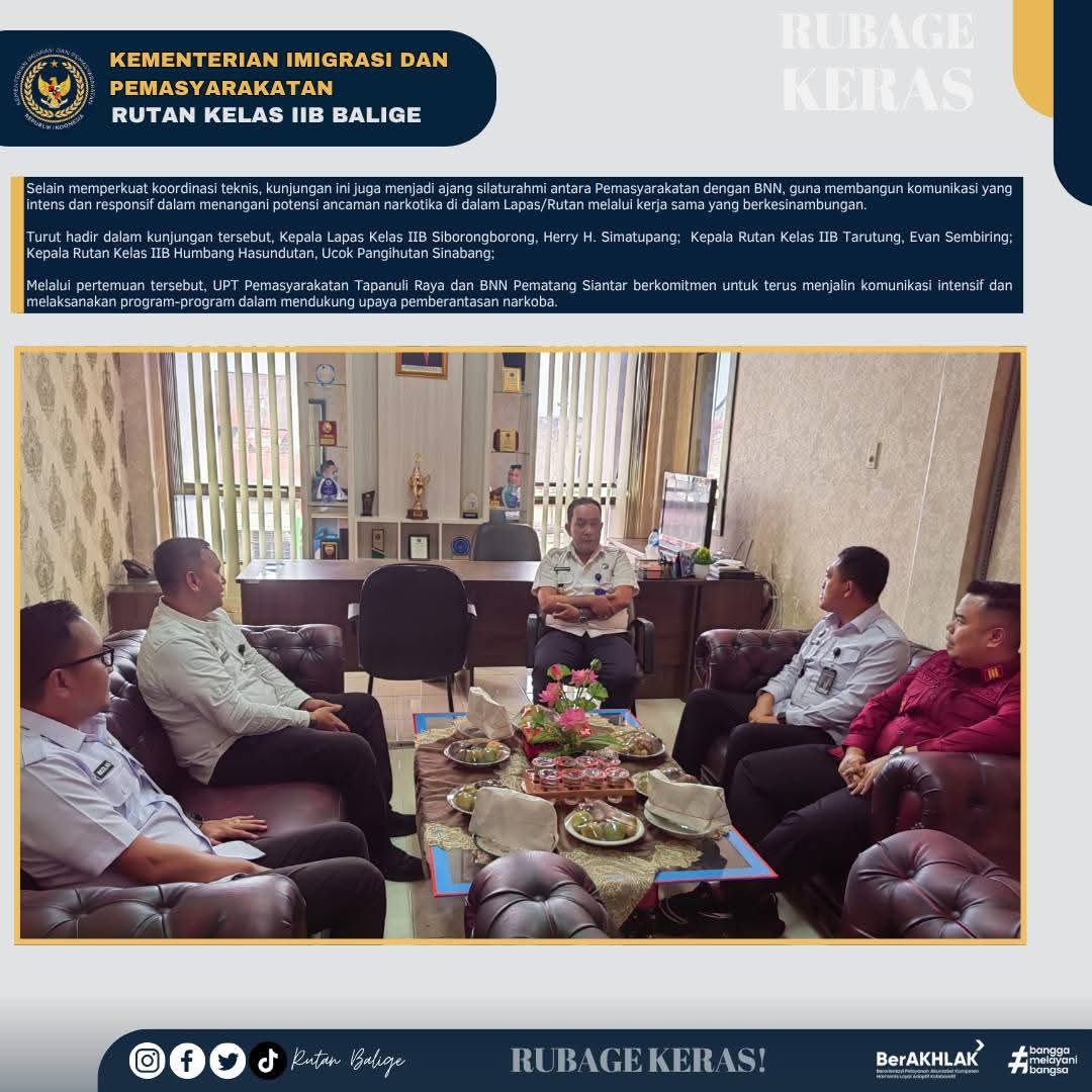 sebarinfo.com, | Kepala Rutan Kelas IIB Balige dan para Kepala Unit Pelaksana Teknis (UPT) Pemasyarakatan se-Tapanuli Raya bertandang ke Kantor Badan Narkotika Nasional (BNN) Kota Pematang Siantar. Mereka sepakat memperkuat sinergi dan kerja sama dalam memberantas narkoba.